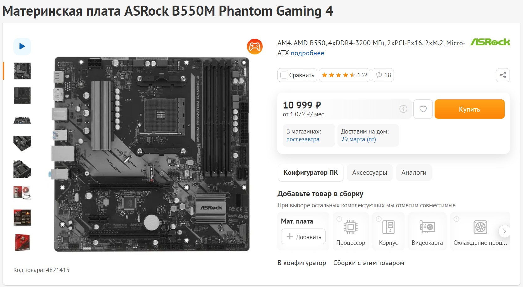 Естественно, с таким процессором ставим хорошую мать на B550 чипсете. Не о каких А520 и старых B450 не смейте и думать. Я не говорю о тех, кто апгрейднул процессор, но не менял плату. С этим всё окей. Компьютер игровой, значит, и мать должна быть игровая. И такая у нас есть. Это Asrock B550M Phantom Gaming 4. Тут 4 слота под оперативную память типа DDR4, 2 разъема M.2, один из которых Gen4. И неплохая подсистема питания, на которой есть хороший радиатор.