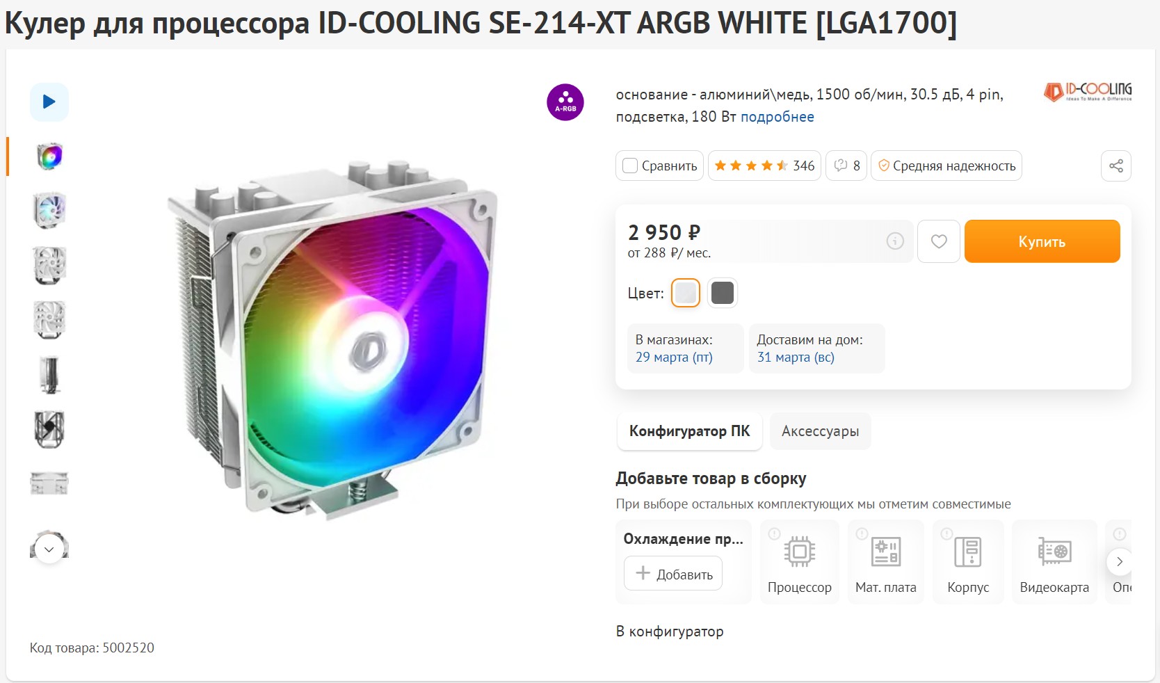Охлаждением этого шестиядерника займется довольно популярный неплохой кулер ID-Cooling SE214XT-ARGB. В радиаторе 4 тепловые трубки, которые достаточно хорошо передают тепло на радиатор. А обдувать будет 120-мм вентилятор. Рассеять этот кулер может до 180 Вт тепла. У вентилятора есть RGB-подсветка, что придаст красоты всей системе.