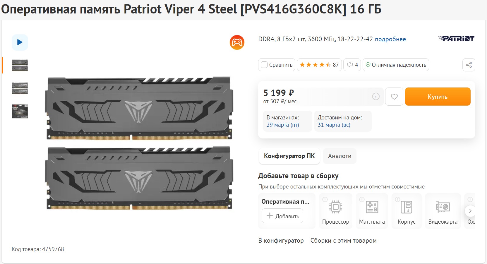 Как мы все хорошо знаем, чем выше частота оперативной памяти, тем лучше для Ryzen. И в этой сборке так и поступим. Берем комплект из двух модулей по 8 ГБ Patriot Viper Steel. Частота этой памяти 3600, тайминги CL18. Устанавливается всё это через профиль XMP. Неплохо за свои деньги, только жаль, что нет подсветки.