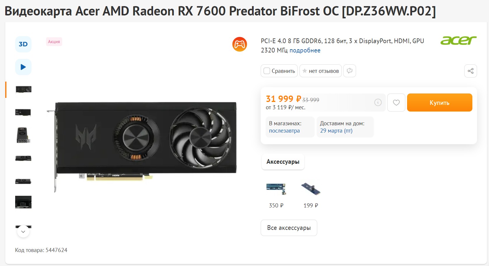 Так как сын моего друга является фанатом AMD, значит, видеокарта должна быть именно от AMD. Сюда можно было бы поставить RTX 4060, но будущий владелец этого ПК негативно относится к компании Nvidia. Переубеждать я его не стал, как говорится, хозяин — барин. Значит, ставим сюда неплохую Acer AMD Radeon RX 7600 Predator BiFrost OC. Predator означает «Охотник». Что уже мы заранее понимаем, что любая новая игра для неё будет жертвой. Она будет лучше, чем популярная RX 6600, и показывает достаточную производительность, сравнимую с RTX 4060. Но, правда, в лучах она все-таки проигрывает, но это было понятно и так. У видеокарты AMD RX 7600 всего 8 ГБ видеопамяти, что окей, конечно, но хотелось бы больше. Но 7600 XT стоит на процентов 20 дороже, поэтому я взял эту.