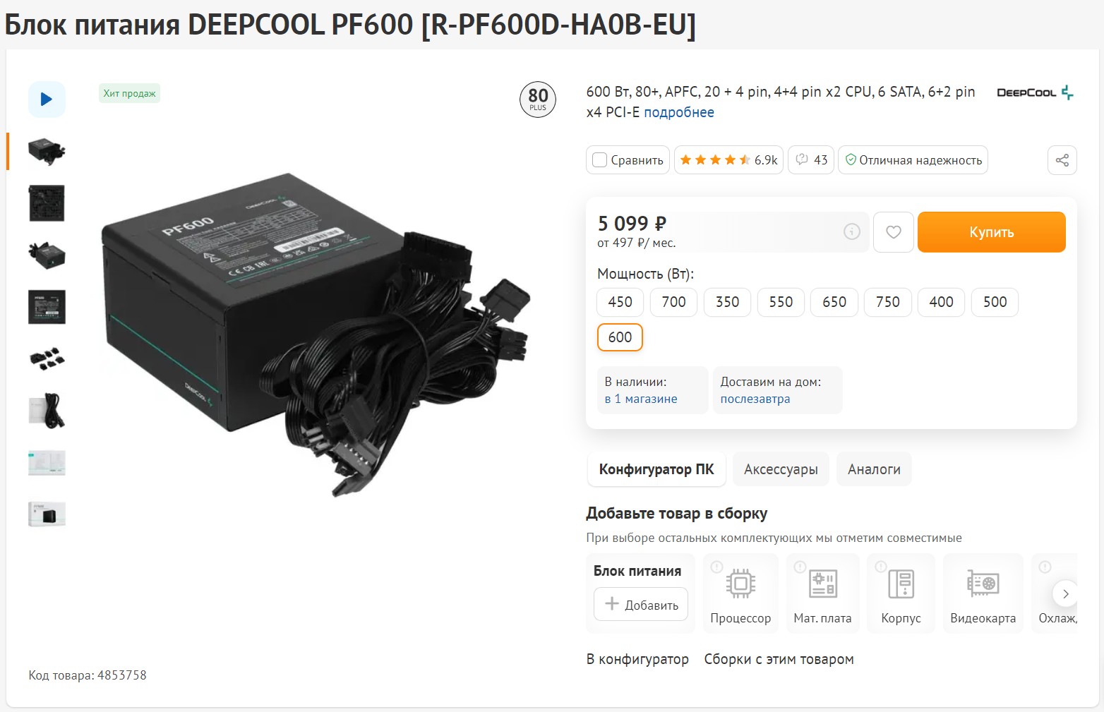 В этом компьютере достаточно прожорливые комплектующие. И для того, чтобы не было просадок по напряжению в системе, нужно к потребляемой мощности добавить 30% сверху. Как раз и получается примерно 600 Вт. Блок питания DEEPCOOL PF600 на 600 Вт отлично подойдет. Тут плоские черные кабели, кстати, достаточно длинные, перечень защит, а также сертификат 80+ STANDARD и реальные 600 Вт. Короче, это неплохой бюджетный блок, который хорошо себя зарекомендовал.