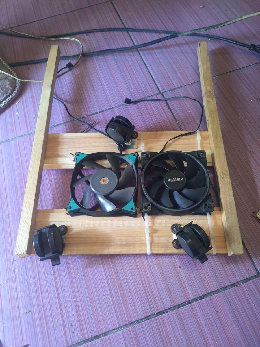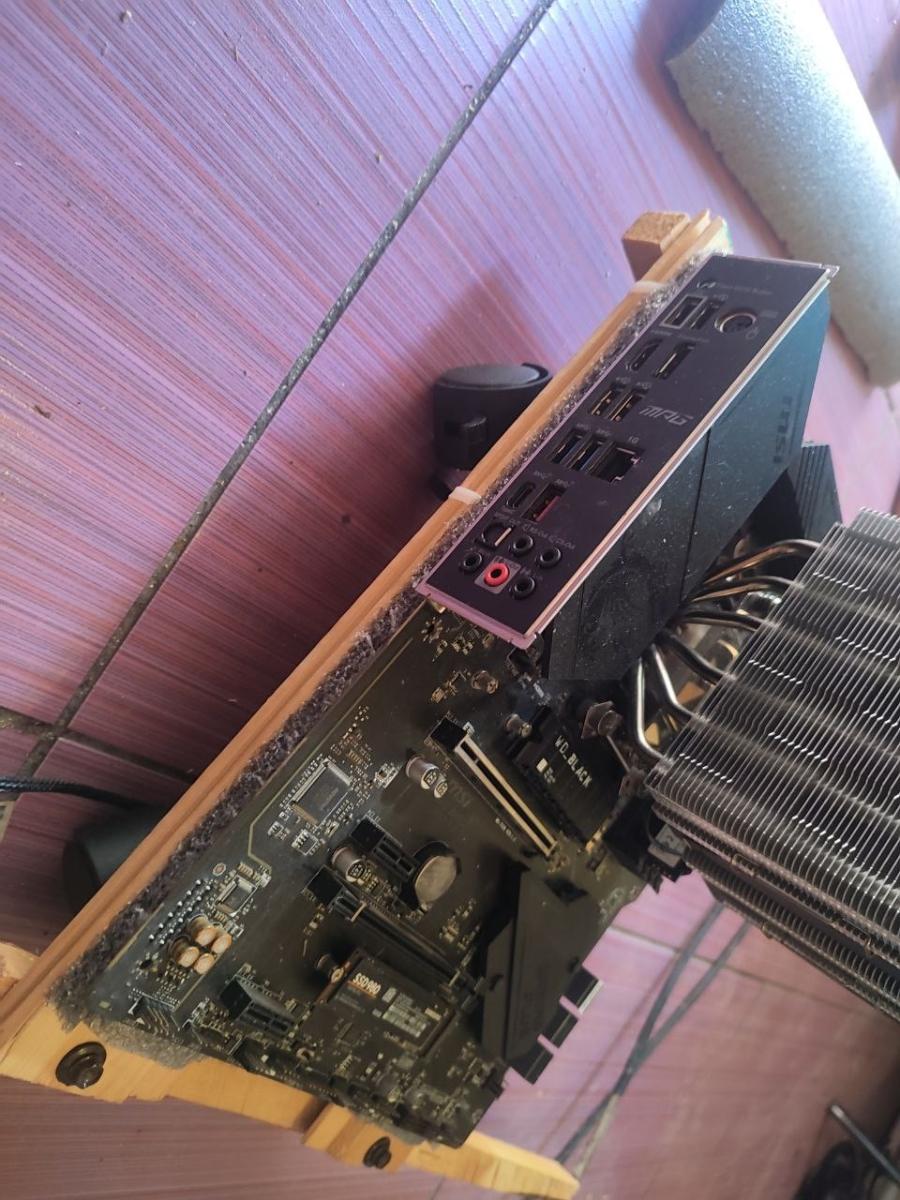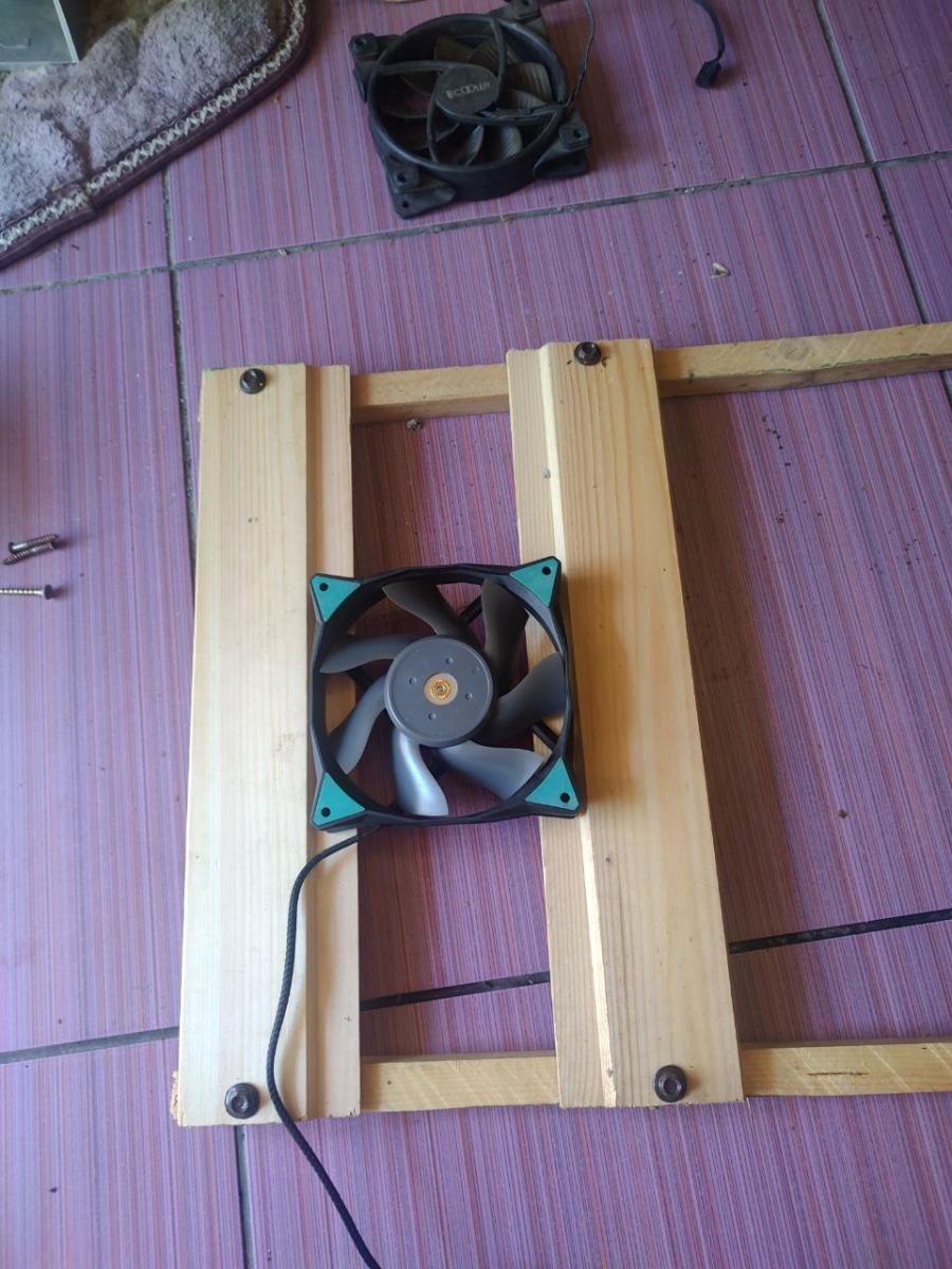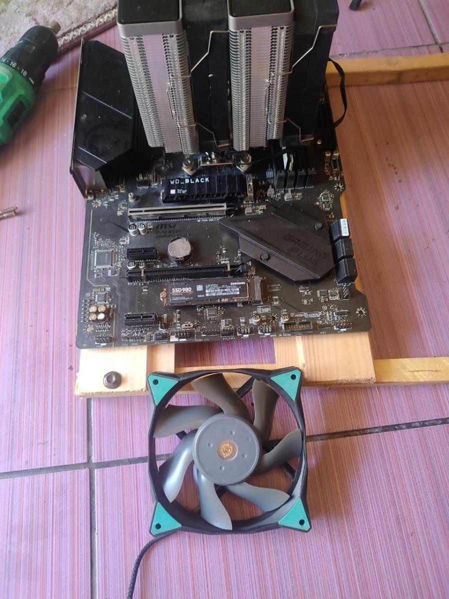Ну что ж, начало есть. Это уже хорошо. Дальше я взял собранный комплект на AM4 и положил на доски. И думаю, а куда, и главное, как я эти вентиляторы приделаю, ведь они толще квадратного бруса, а значит, что они будут в вакууме крутиться, не принося пользы моему компьютеру, а точнее, не охлаждая материнскую плату.
