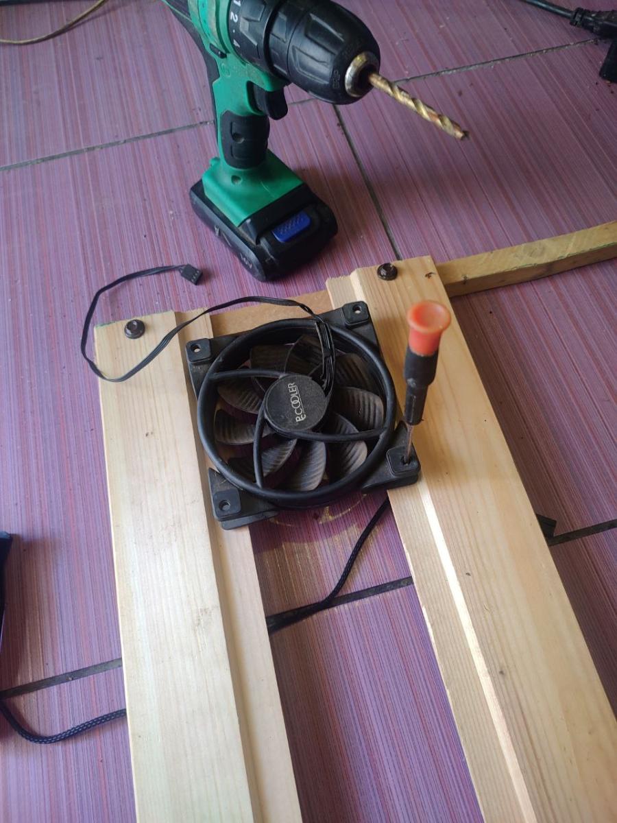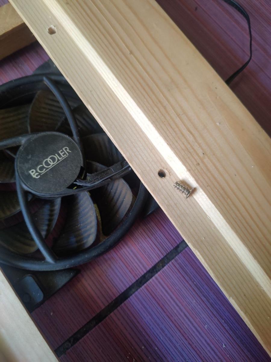 Но я подумал, что это не такая уж и проблема, и я обязательно что-нибудь придумаю. Я замерил расстояние, где будут вентиляторы, и убрал комплект на AM4 в сторону. Я знал, что надо сверлить, и пошёл искать сверло по дереву. Далее я взял вентилятор и отвертку и наметил, где сверлить.