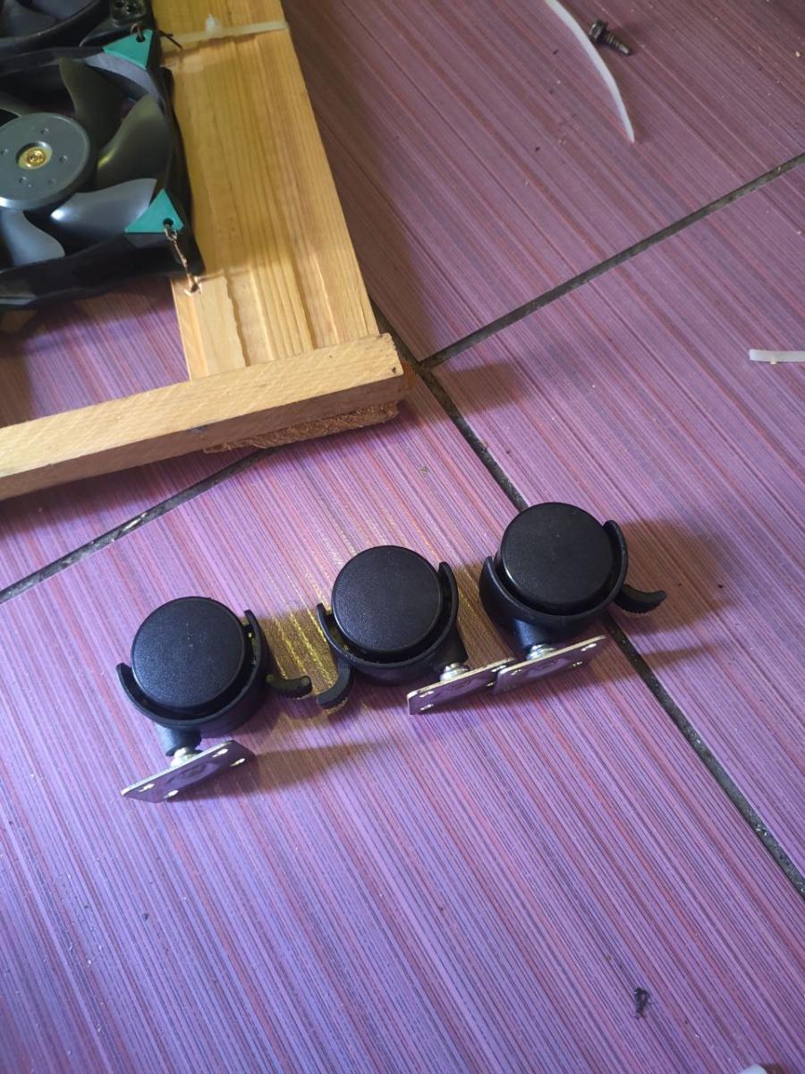 Но проблема всё же осталась. Как я писал выше, что вентиляторы толще, чем бруски, и мой корпус для ПК «стоит» на вентиляторах. Поэтому я начал думать, как решить эту проблему. Мне повезло, я нашел в сарае три колеса вращения на 360 градусов. Я уже не помню, зачем я их покупал, но сейчас они мне очень сильно пришлись как-никак кстати. Их изначально было четыре штуки, одно я так и не сумел отыскать. Но у меня по городу часто ездит мужичёк на мотороллере «Муравей», и там ведь тоже три колеса, значит, если я правильно их прикручу, то мой корпус для ПК будет стоять устойчиво.