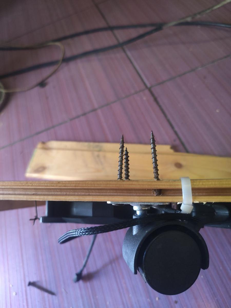 Но, к сожалению, они сломались не у основания доски. Саморезы выпирали примерно на 1 мм, а это категорически неприемлемо, ведь это именно та часть моего корпуса для ПК, где будет расположена материнская плата. И может произойти короткое замыкание с этим шурупиком, что чревато последствиями, а именно выходом из строя комплектующих. Я быстро включил смекалку, сотни прочитанных блогов автора Chimbal`а не прошли даром. Решил выкрутить шурупики и надеть шайбу. Всё получилось, я проделал эту операцию со всеми колесиками, результат мне понравился.