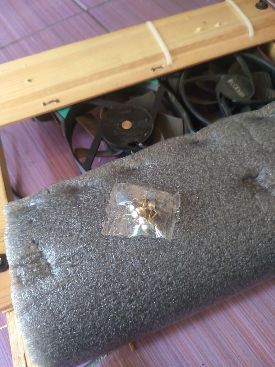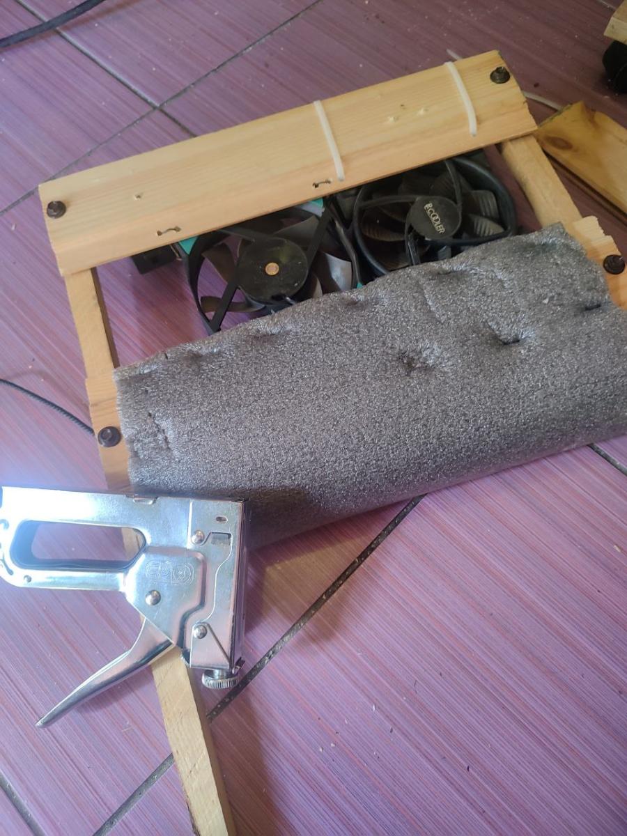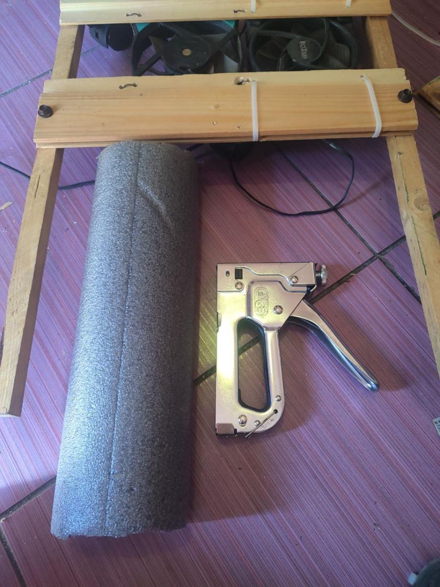 Но я заметил что материнская плата в моем порпусе немного `гуляет` . Возможно это связано с тем что бруски не идеально ровные или паркетная доска. Я понял что так оставлять нельзя, потому что когда компьютер работает , он издает микро-вибрации. От вентилятора процессора или видеокарты. И нужно что то предпринимать. Я у себя дома делал отопление и у меня остался паралон для труб. Это тощто надо, он в меру плотный и довольно мягкий. Идеальный вариант для подложки под материнску плату. Явооружился строительным степлером и принялся его приклёпывать.