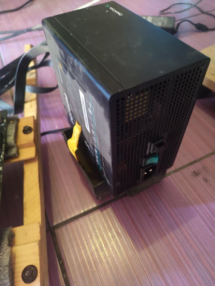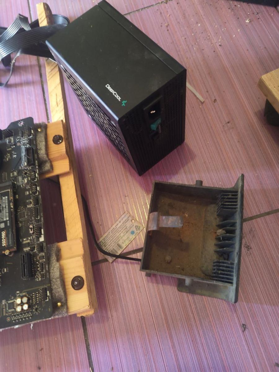 Я уже смотрел на свой корпус для ПК с чувством, что ещё немного, и корпус готов. Осталось видеокарту поставить, и всё. Но потом я поднял глаза на стол и увидел там... блок питания. А я про него вообще забыл. И, как видите, места уже нет. Тут либо добавлять ещё одну доску, либо что-то думать. Я взял блок питания и положил его за материнскую плату, но мой корпус для ПК стал провисать то влево, то вправо, так как в задней части, где 24-pin разъем, там одно колесико. Я не знал, как выйти из этой непростой ситуации, и хотел даже бросить это дело, но меня вдохновлял Chimbal, и я не мог подвести своего учителя. В общем, пошел я в гараж искать то, не зная что. И я обратил внимание на пепельницу от какой-то машины и подумал, что она идеально подойдет.