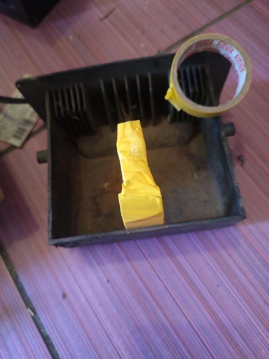 Но, как оказалось, пепельница с нюансом. Посередине торчала металлическая пластина. Это хорошо с одной стороны, ведь она будет отлично держать блок питания, но с другой стороны, этой пластиной я могу полностью поцарапать блок питания и, как следствие, убить товарный вид перед потенциальным покупателем. Ну тут я сразу смекнул, что надо просто обмотать изолентой эту пластину, и проблема будет решена, что я собственно и сделал, и результат меня удовлетворил.