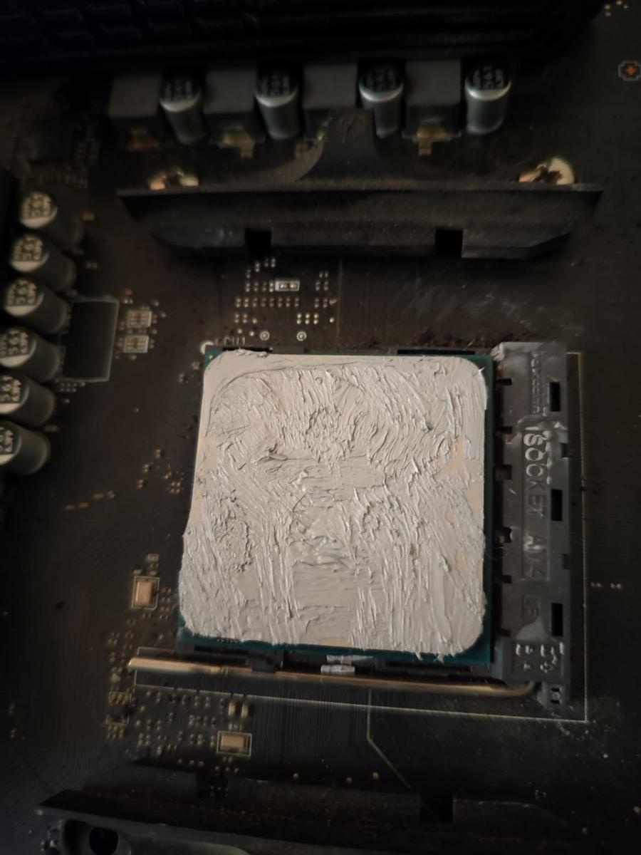 Я уже боюсь откручивать кулер на сокете AM4 — ведь в 99% случаев процессор прилипает к пятке кулера. Каждый раз это как игра в рулетку... Надеюсь, это была последняя замена термопасты на этом «особенном» сокете. И знаете что? Я был реально в шоке: кулер не прилип к крышке процессора! Чудеса, да и только. Наверное, просто повезло.
