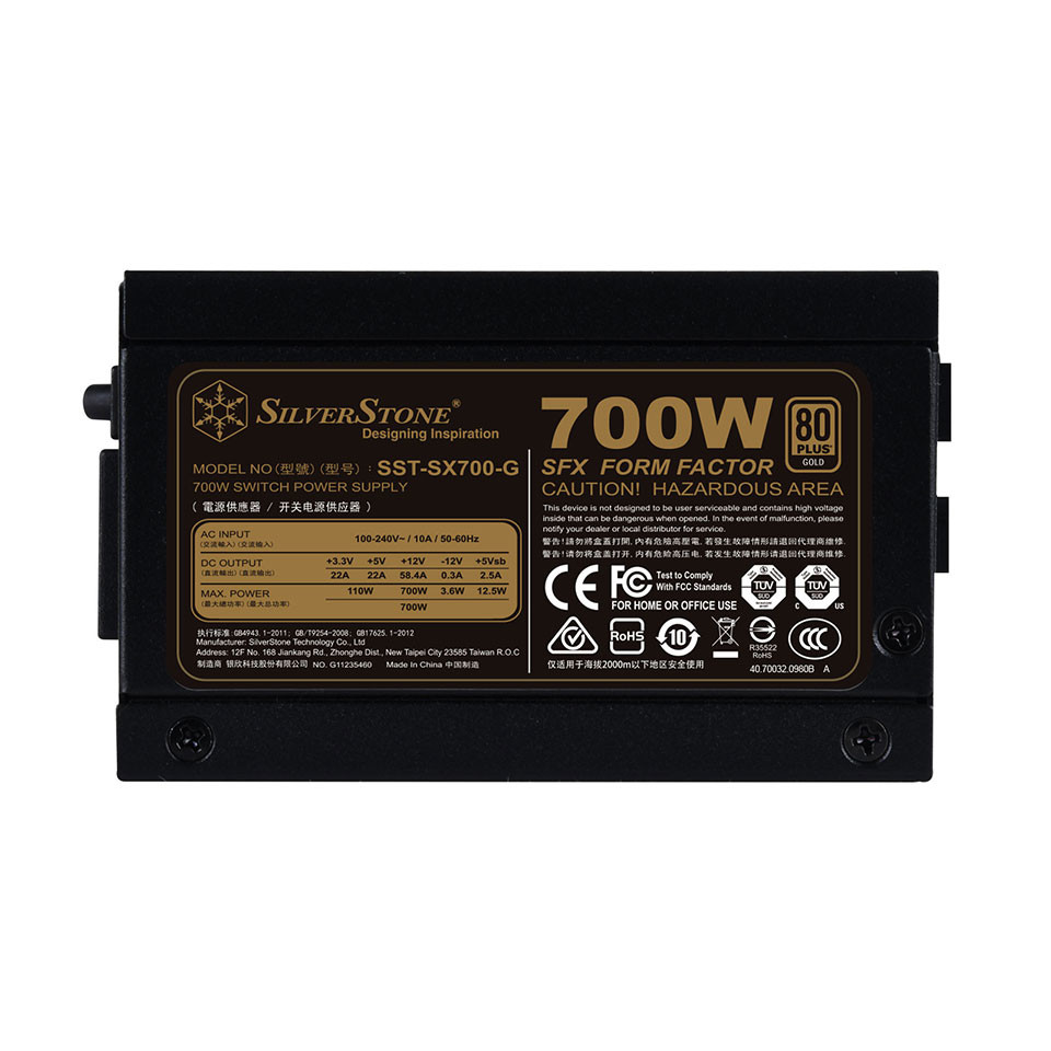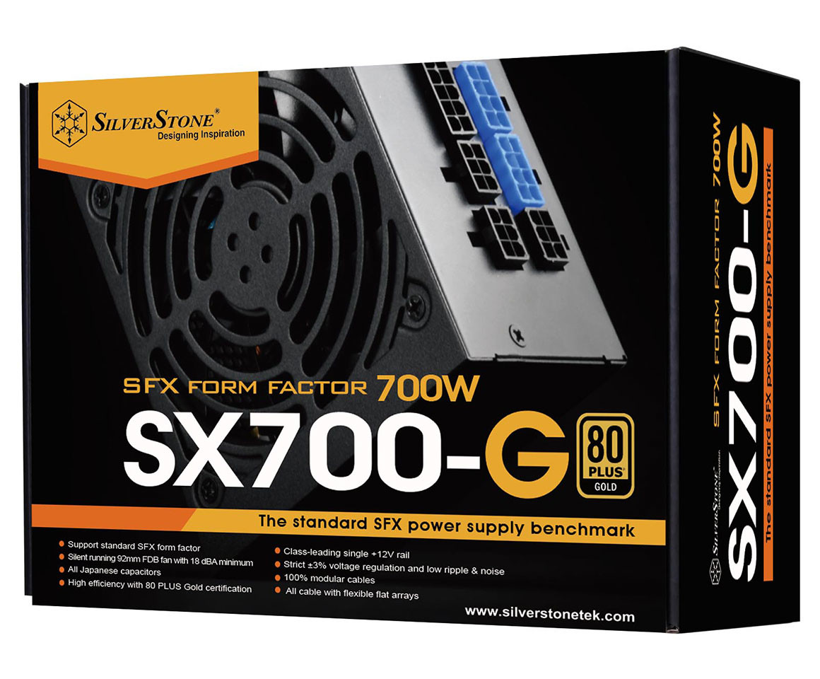SilverStone начала продажи нового блока питания SX700-G SFX – самого мощного блока в формате SFX. Блок предназначен для компактных сборок с двумя видеокартами. Блок полностью модульный. Все кабели выполнены плоскими, для облегчения их монтажа. Сертификат 80 Plus Gold. Имеется активный PFC, защита от перегрузки и пониженного напряжения, от перегрева, от короткого замыкания. За охлаждение отвечает вентилятор диаметром 92 мм с гидродинамическим подшипником. Пассивного режима нет. В пределах нагрузки в 350W вентилятор крутится с частотой 1200 оборотов, при нагрузке от 630W вентилятор раскрутится до своего максимума в 2800 оборотов.
