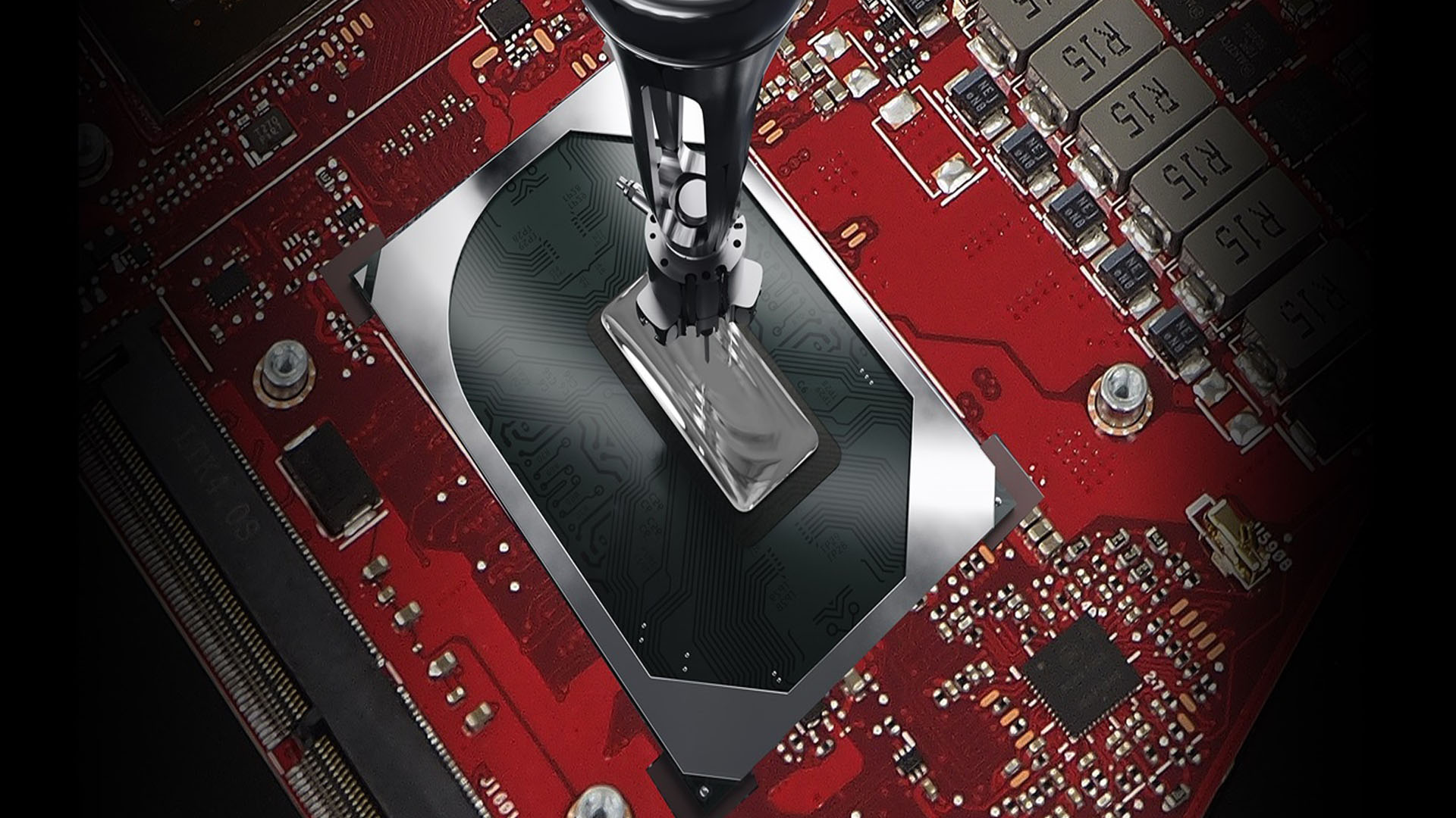 Для этих целей был выбран состав Thermal Grizzly Conductonaut, разработанный компанией Thermal Grizzly. При этом, инженерам и технологам компании пришлось встретиться с одной трудностью, а именно – необходимостью разработать технологию точного нанесения состава автоматизированным способом, которая обеспечивала бы защиту от его растекания по плате и другим компонентам. Данная проблема ранее затрудняла промышленное применение данного решения на крупносерийном автоматизированном производстве, при том, что оно уже завоевало популярность у мастеров-энтузиастов благодаря хорошим теплопроводным характеристикам таких составов. На решение данной задачи потребовался целый год.