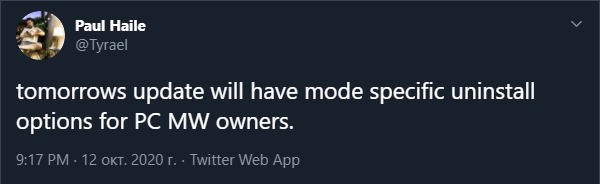 Пол Хейл, Директор Infinity Ward, в своем Twitter пообещал, что последнее обновление для ПК-версии Call of Duty: Modern Warfare от Infinity Ward привнесет возможность удалять игру модульно. Так, геймеры смогут вернуть себе часть места на жестком диске, которое занимает игра. Работоспособность последней сохраняется, соответственно.