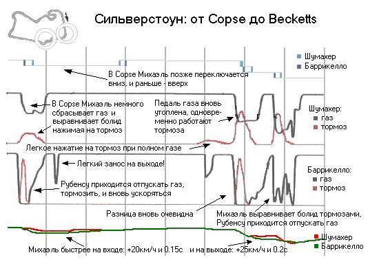 Невозможно пройти Copse не сбросив газ. Замедление очень небольшое, но пилоты Ferrari используют совершенно разную технику. Шумахер сбрасывает его до 60% и одновременно нажимает на тормоз с усилием в 20% для того, чтобы сохранить баланс болида. Баррикелло использует только правую ногу, и для него такой способ не годится, поэтому он полностью сбрасывает газ, жестко притормаживает и снова утапливает акселератор в пол. Благодаря контролю тяги ускорение обоих пилотов одинаково, но комплекс Becketts снова демонстрирует нам разницу в стиле вождения Шумахера и Баррикелло. Михаэль не отпускает газ и пользуется тормозами для выравнивания болида. Рубенс тормозит только один раз, и для выравнивания болида вынужден пользоваться акселератором.