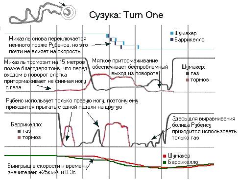 Это – самый показательный пример для демонстрации техники вождения Михаэля. Он тормозит на 15 метров позже, чем Рубенс, но это только небольшая деталь. В то время как бразилец переводит ногу с газа на тормоз и наоборот, Михаэль нажимает обе педали одновременно. Он начинает торможение задолго до Рубенса (с усилием в 5% от максимального), но при этом не отпускает полностью выжатую педаль газа. Затем, уже в повороте, Шумахер тоже ни на секунду полностью не сбрасывает газ. На выходе Михаэль усиливает давление на акселератор, и одновременно слегка (с усилием в 2-3%) притормаживает. А Рубенсу приходится тормозить и разгоняться попеременно. Поэтому он гораздо медленнее на входе, и в большей части поворота. Ускорение на выходе он начинает чуть раньше, но к этому моменту ему уже приходится выступать в роли догоняющего.