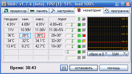 Прогрев производился S&M 1.7.6. (beta) при 100% нагрузке в течении 30 минут.