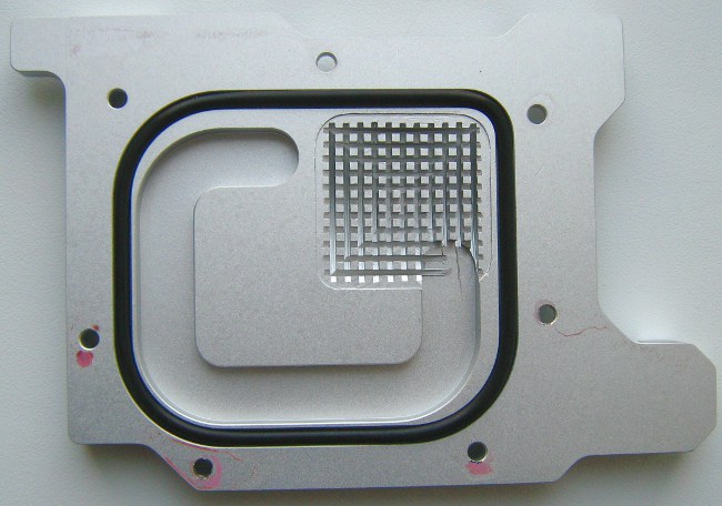 Над GPU фрезерована штыревая структура. Изначально это квадрат 10 * 10 штырьков с квадратным сечением. Но, видимо для более легкого выхода жидкостного потока часть штырьков (8 штук) убрано перед входом в «С» образный канал для охлаждения чипов памяти.