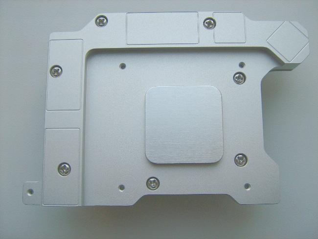 Водоблок для GPU и памяти имеет разборную конструкцию, чем я и воспользовался. Начнем с самого интересного – основания. Площадки, контактирующие с элементами ровные. Однако на основании явно заметны следы фрезы, которые слабо, но ощущаются тактильно.