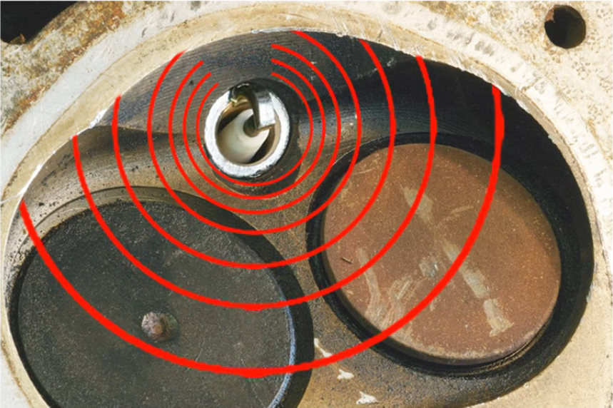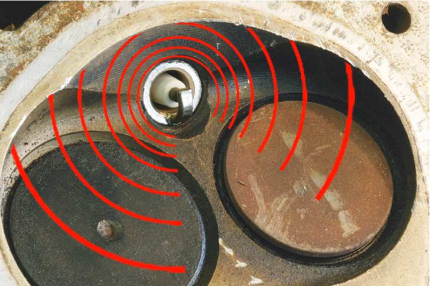 При оптимальном варианте ориентирования, от искрового зазора, обращенного в объем камеры сгорания происходит равномерное и быстрое распространение фронта пламени. В результате чего топливо сгорает полностью и мощность двигателя максимальна.
