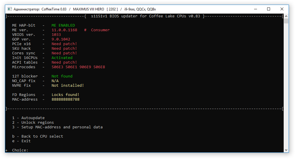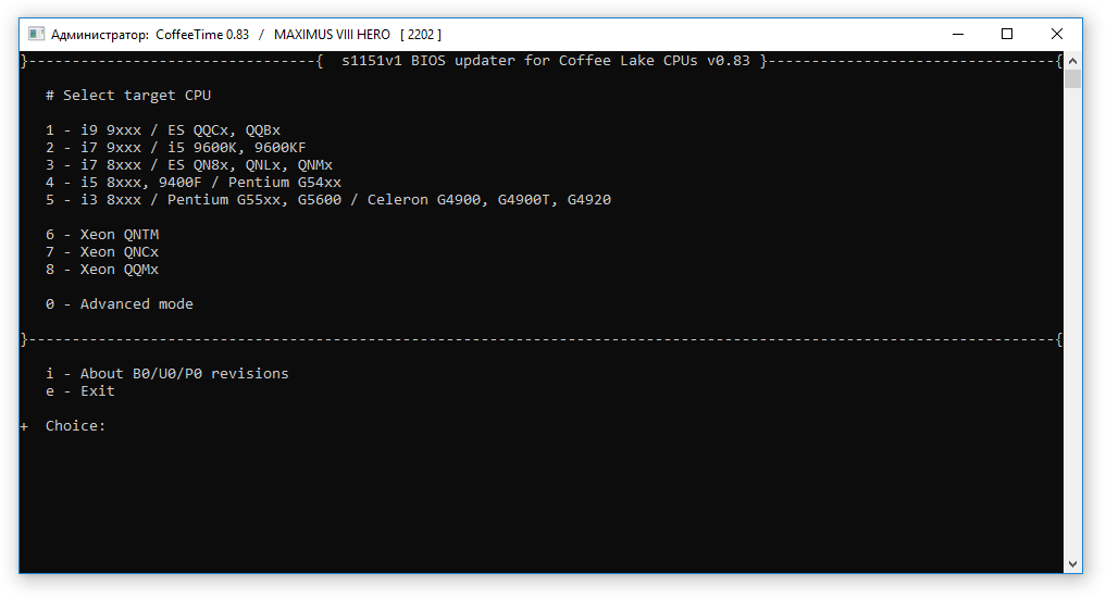 В прошлой статье рассматривал возможность установки Coffe Lake процессоров на материнские платы на 2XX чипсетах с применением БИОС от 3XX версий этих же плат. Такой подход крайне сложен в реализации для 1XX чипсетов, но прецеденты есть. По всему выходило, что для каждого случая необходима ручная модификация исходного БИОС, так как автоматические решения от revlaay не отличались стабильностью результата. Но прогресс не стоит на месте и благодаря svarmod в наших руках есть мощнейший инструмент по модификации БИОС 1ХХ/2ХХ плат под использование не только с серийными Coffe Lake, но и их инженерными версиями и серверными аналогами, - CoffeeTime.