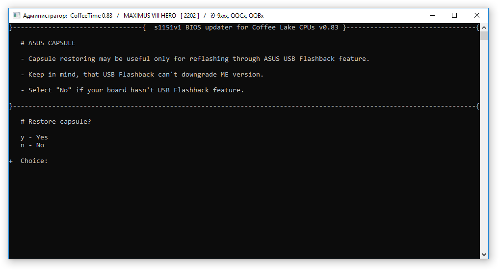 В версии 0.83 CoffeeTime, для запуска 9900K на ASUS Maximus VIII серии есть особенность: автоматически подставляемый микрокод работает исправно, но появляется AVX offset -1, который можно отключить из-под Windows средствами Intel XTU. При использовании микрокода версии 0x96 такой проблемы нет, svarmod изготовил соответствующую версию БИОС для HERO VIII, делюсь этим файлом.