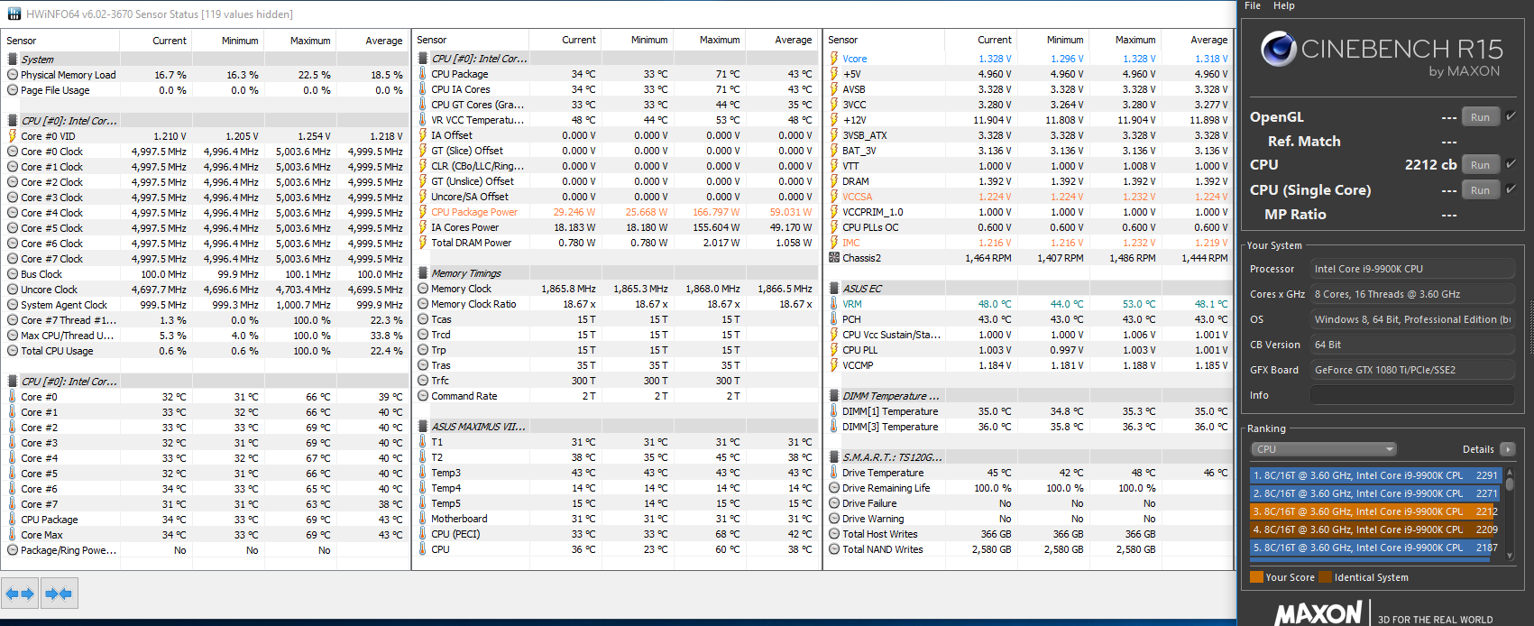 В первую очередь интересно было проверить информацию о троттлинге 16 поточного процессора на Maximus VIII серии, опасения не подтвердились, 5ГГц дались легко, и я уверен, что это не предел для этой платы.
