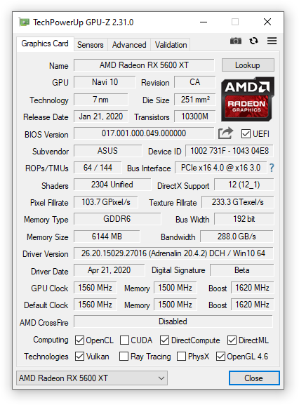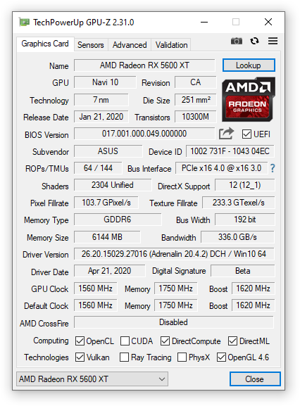 Обозреваемый экземпляр ROG STRIX RX 5600 XT оказался из ранних партий, версия BIOS содержит частоты ниже заявленных. Проверим параметры работы видеокарты в такой конфигурации.