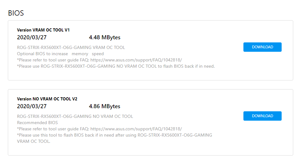Получить из магазина вариант с неактуальной версией BIOS - вполне реальная ситуация, многие производители уже разослали крупные партии по магазинам к моменту решения AMD повысить рабочие частоты RX 5600 XT. Для решения этой проблемы ASUS разместила на своём сайте приложение обновления прошивки для ROG STRIX 5600 XT.