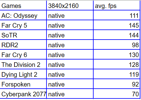 Игры тестировались во встроенных бенчмарках, в разрешении 3840х2160, c максимальными настройками графики (в RDR 2 отключена тесселяция деревьев, в Cyberpunk 2077 отражения с Невероятно исправлены на Впечатляюще; обе настройки неоправданно руинят fps). В синтетике PL был увеличен до максимума, с разгоном видеокарты до 3075 Мгц. Для каждого теста брался лучший результат, тесты в играх проводились на следующих настройках в драйвере