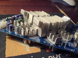 С этим кулером разгон составил 535\715 (gpu\memory), тайминги памяти изменены. Температуры примерно 40 градусов в простое, в играх 54-55, 59 – максимум под нагрузкой (ATItool). Долго думал, ставить ли радиаторы на память, решил поставить и в итоге разгон памяти увеличился на 15мгц и итоговый разгон составил 535\730. Правда при установке радиаторов возникла одна проблема: backplate нависал над одним из чипов памяти и не давал установить радиатор. Пришлось согнуть 8 ребер радиатора и тогда он встал.