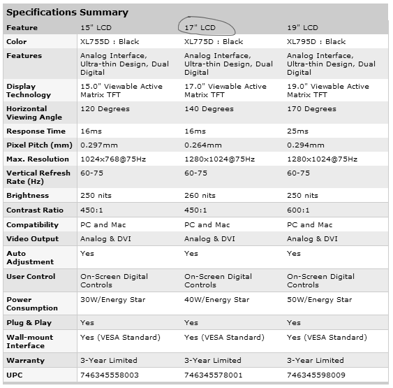 Надо было искать причину. Сначала я решил, что виновата видеокарта ATI Radeon 9800se. На один вечер был срочно одолжен Leadtek Geforce 6800LE, но безрезультатно. Картинка оставалась размытой. Значит всему виной монитор, решил я. На следующий же день я ввалился в магазин-склад, где работал мой бывший коллега. Из двух-трех десятков мониторов, лежавших на складе, мне понравились лишь два. Это были Samsung 710N/Т и Xerox XL 775D. Модель 710Т сразу же отпугнула меня ценой, зашкаливавшей за 400 евро. Samsung 710N отпугнул меня значительно позже „отсутствием наличия“ (© коллега) разъема DVI. Четкость с D-Sub не идет ни в какое сравненное с четкостью DVI.