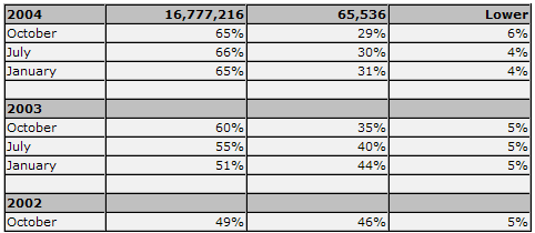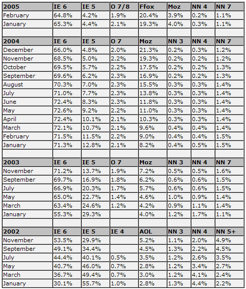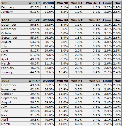 <br/><br/><br/><br/>Судя по данной статистике доля браузеров на ядре IE стремительно сокращается. Но, если эта динамика сохранится, то к 2006 году и выходу ОС Longhorn с новым IE, нынешний браузер от Майкрософт сможет удержать свои доминирующие позиции. Другая таблица отображает статистику ОС, "гуляющих" по просторам интернета.