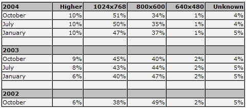 Как показывает следующий график, большинство пользователей интернета работают в разрешении 1024х768. Но, тем не менее, треть пользователей все еще продолжает видеть интернет в разрешении 800х600.