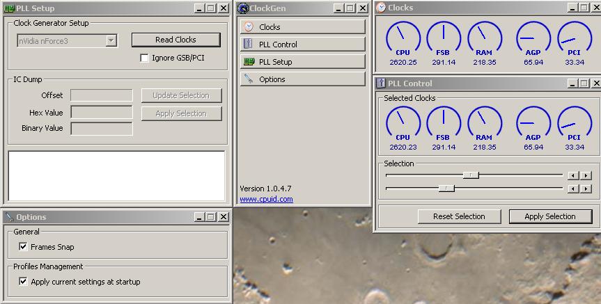В меню находятся четыре раздела:Clocks, PLL Control, PLL Setup, Options.Каждый раздел открывается в отдельном окне, что позволяет видеть все разделы одновременно.