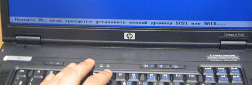 В самом начале компьютер спросит, надо ли установить дополнительный драйвер RAID контроллера. Жмём F6. Через некоторое время бук предложит выбрать необходимый драйвер. Вставляем дискету и следуем указаниям установщика. Уже прогресс – винт стал виден! Выбираем диск, форматируем его (если надо – разбиваем на части) и ждём окончания установки.