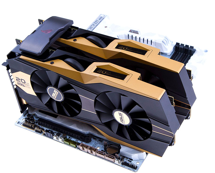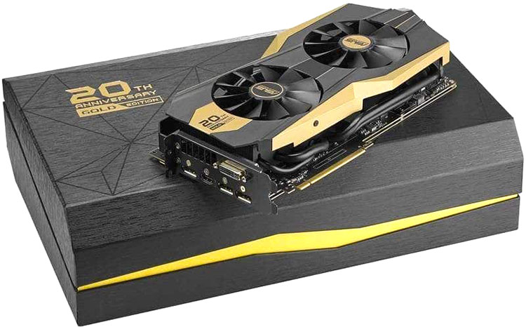 ASUS GeForce GTX 980 20th Anniversary Gold Edition – эту видеокарту можно назвать богиней. Она была выпущена к 20-ти летнему юбилею компании и продавалась в ограниченных количествах. Референс GeForce GTX 980 тогда продавался по рекомендованной цене в 499 долларов США, а юбилейная видеокарта стоила все $620. Хотя на сегодня это сущие копейки.