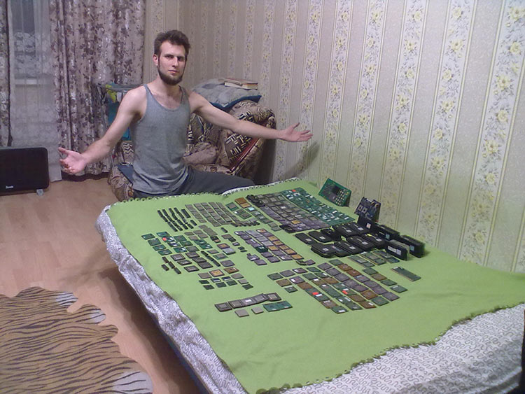 Вот еще одна древняя фотография коллекционера центральных процессоров. В отличие от видеокарт, процессоры легче хранить, но для проверки опять нужны материнские платы и видеокарты – получается замкнутый круг.