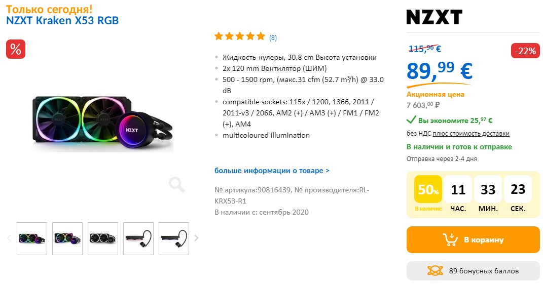 Сейчас на главной странице сайта висит, по мнению владельцев магазина, самое интересное предложение. Только сегодня! AIO NZXT Kraken X53 RGB за 89,99 € или -22% или 7 603,00 ₽. Вы экономите 25,97 €!