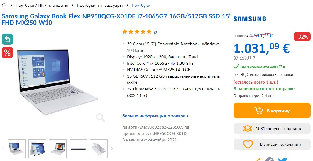 За 1.511,76 € или со скидкой -32% что получается 1.031,09 € или 87 113,91 ₽ с экономией 480,67 € вы можете приобрести если успеете ноутбук, чуть по проще предыдущего - Samsung Galaxy Book Flex NP950QCG-X01DE i7-1065G7 16GB/512GB SSD 15" FHD MX250 W10.