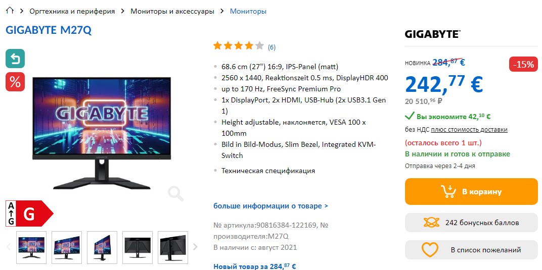 Ищите игровой 2К монитор? Computer Universe предлагает с 15% скидкой LCD монитор GIGABYTE M27Q за итоговую стоимость 20 510,96 ₽ или чистая экономия 42,10 €.