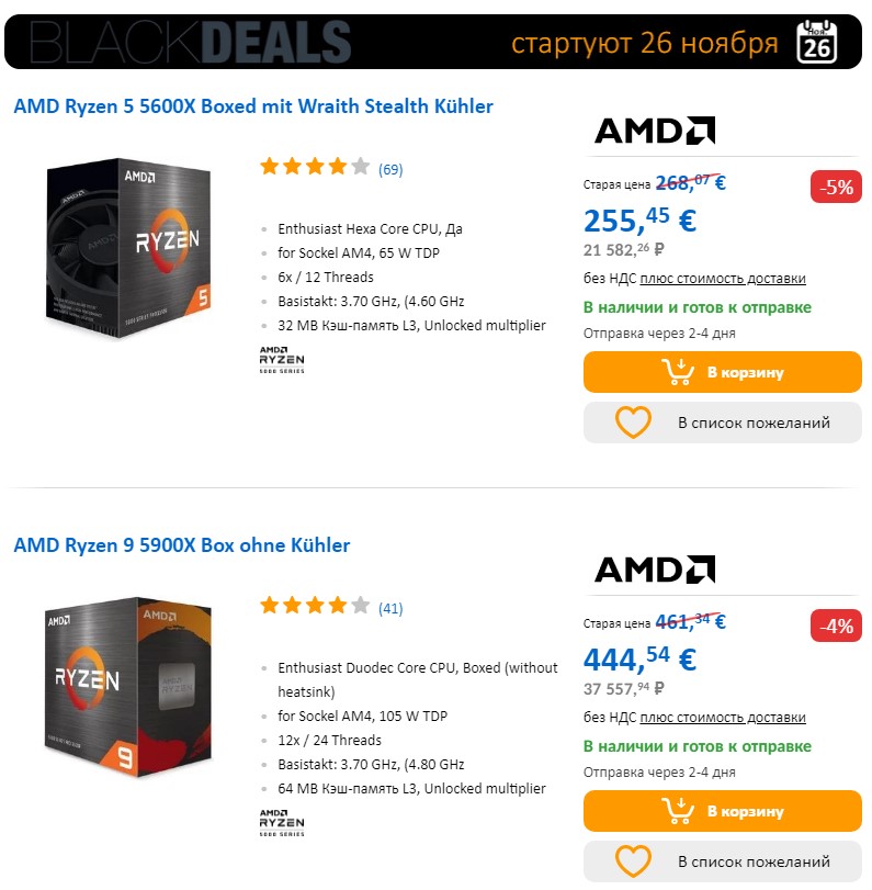 Цены на популярные модели процессоров AMD Ryzen компьютерный дискаунтер сильно не спешит снижать. Так с учетом 5% скидки AMD Ryzen 5 5600X обойдется вам в 21 582,26 рубля, а AMD Ryzen 9 5900X с уже 4% скидкой в 37 557,94 рубля. Можно сделать вывод, что не смотря на выход новых процессоров Intel Alder lake c сокетом LGA1700, процессоры AMD Ryzen и так берут хорошо. Иначе бы скидка была бы 25% и более?