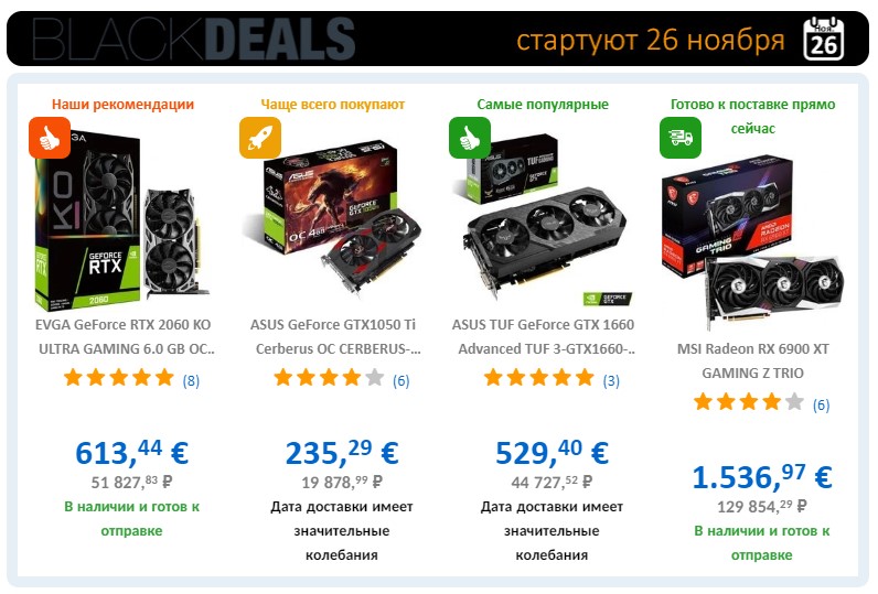 Вашему вниманию предоставляются самые популярные видеокарты, которые чаще всего покупают клиенты CU. Это модели EVGA GeForce RTX 2060 KO ULTRA GAMING 6.0 GB OC за 51 827,83 рубля, ASUS GeForce GTX1050 Ti Cerberus OC CERBERUS за 19 878,99 рубля, ASUS TUF GeForce GTX 1660 Advanced TUF за 44 727,52 рубля и как не странно MSI Radeon RX 6900 XT GAMING Z TRIO за 1.536,97 € или 129 854,29 рубля.