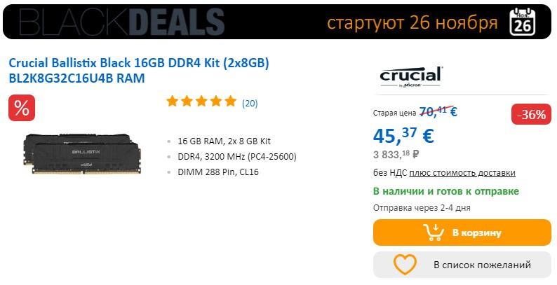 Лидер скидок среди оперативной памяти набор Crucial Ballistix Black 16GB DDR4 Kit (2x8GB) BL2K8G32C16U4B. С учетом 36% скидки его можно приобрести за 3 833,18 рублей.