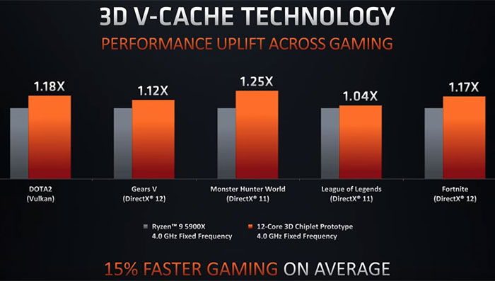 Благодаря такому расположению AMD утроит максимальный объем кеш-памяти третьего уровня с 64 Мб до 192 Мб. Согласно внутренним расчетам AMD, Ryzen 9 5900X с 3D V-Cache может обеспечить повышение игровой производительности до 15% (в среднем) при разрешении 1080p.