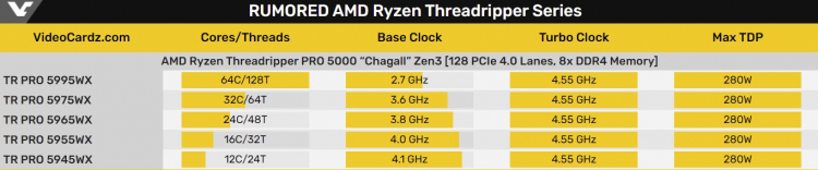 4. В HEDT секторе наконец-то произойдут изменения. Скоро должен состояться анонс настольных HEDT-процессоров Ryzen Threadripper PRO 5000, которые предложат от 12 до 64 ядер с архитектурой Zen 3 с частотой до 4,55 ГГц.