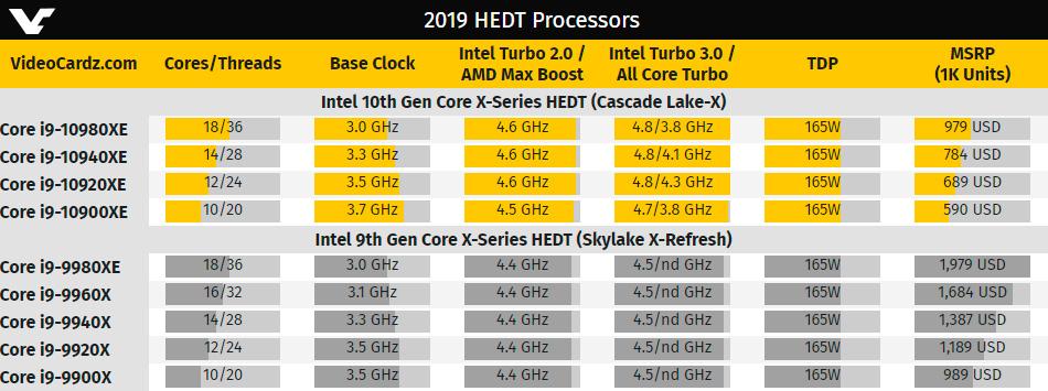 Пока HEDT линейка Intel выглядит следующим образом, и она не обновлялась очень продолжительное время.