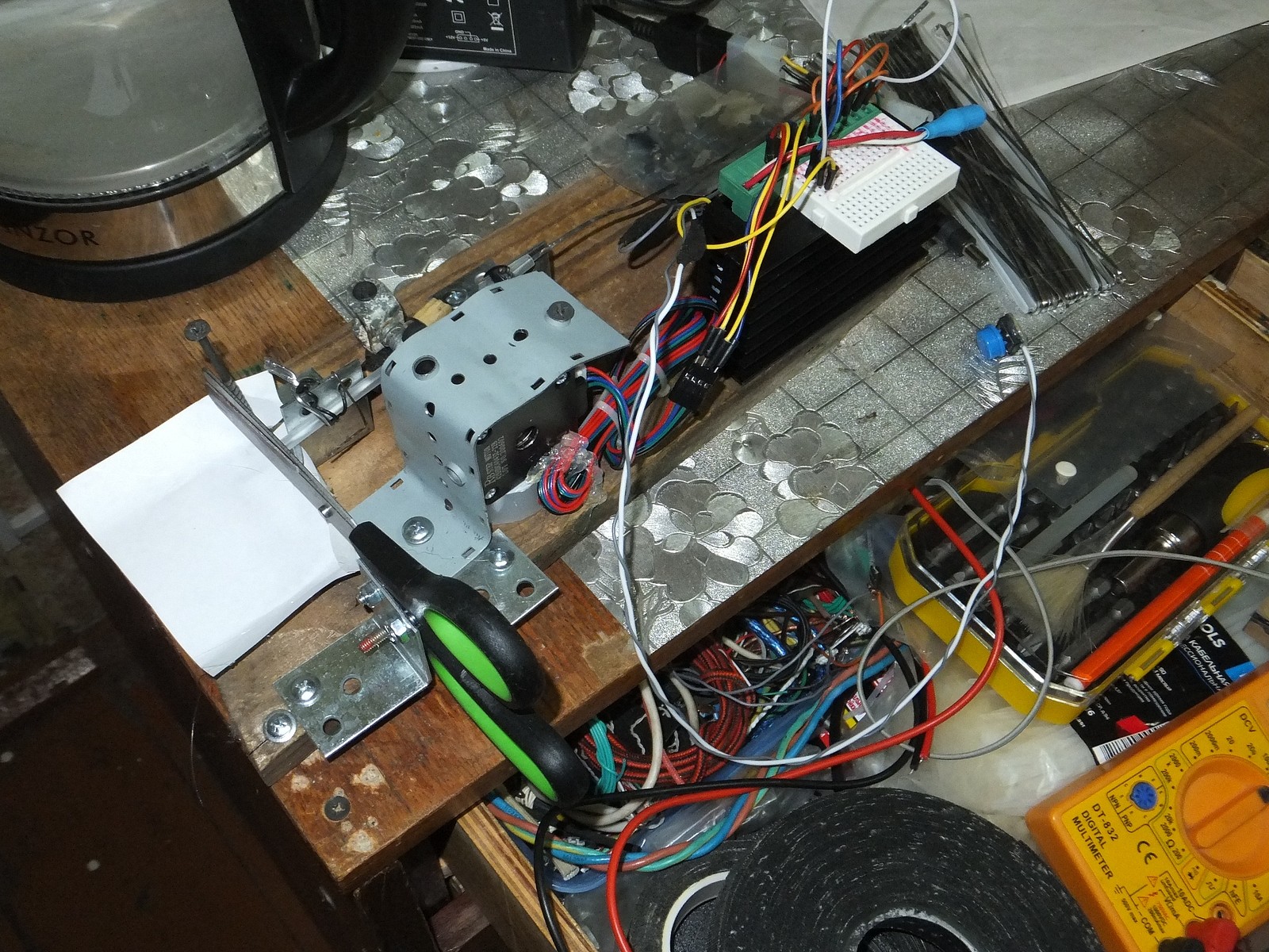 Принцип работы станка прост, можно реализовать даже механически, но я реализовал с помощью микроконтроллера ATMega328P, шагового двигателя с драйвером TB6600, резинкой от принтера на вале и подшипником китайским.