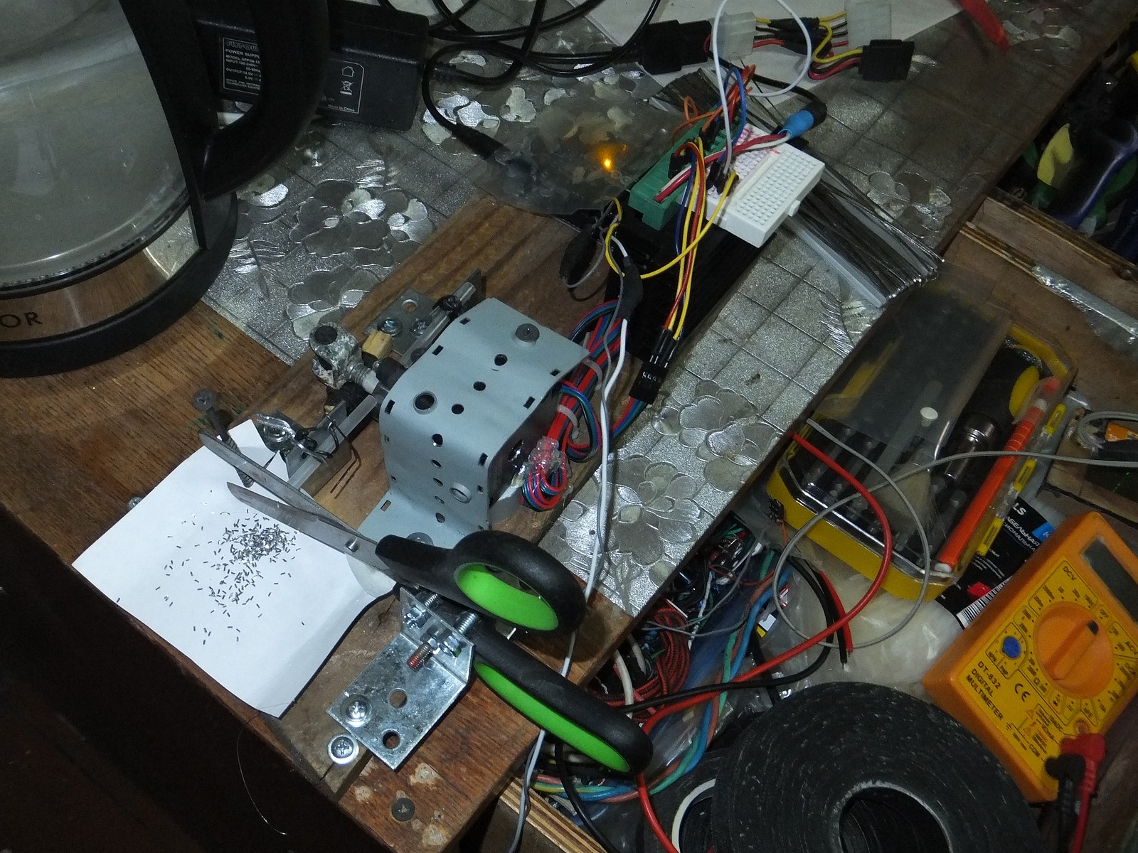 В итоге я собрал небольшой станок для нарезки ленты на равные части, можно было конечно и ножницы автоматизировать, но я решил пока не усложнять и без того собранную из "деревяшек и палок" конструкцию...
