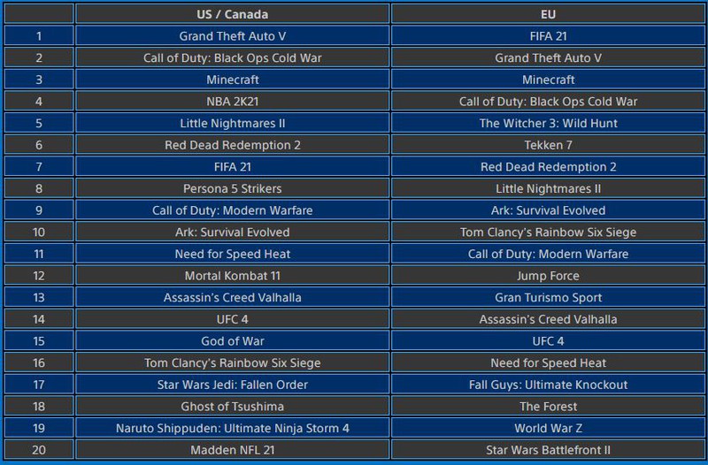 - Сша/Канада — на первом месте удобно сидит ГТА 5, на втором расположилась Call Of Duty: Black Ops Cold War, а на третьем угадайте что? Майнкрафт! Удивил?