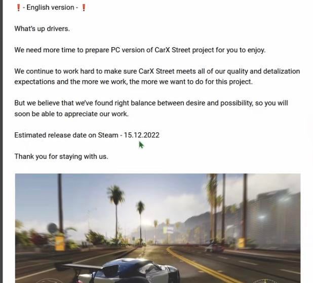 Сперва у разработчиков получилось выпустить игру на iOS. Правда были баги, плохая оптимизация, проблемы с прорисовкой и нагрев устройств. Вкупе с троттлингом это превращалось в очень сложную игру. Со временем разработчики понемногу оптимизировали игру, и мы приближаемся к сентябрю. И! Создатели анонсировали новый перенос для ПК версии. И чет не удивили уже как-то, это уже норма для CarX Street была. Четвертый перенос, прямо конкурент Skull and Bones. Создатели сказали, что им нужно больше времени на разработку ПК версии, и они сказали, что примерная дата релиза на ПК - 15 декабря 2022 года. В целом задержка была не такой долгой, поэтому сообщество не сильно негативно восприняло новость. Это как бы давало нам надежду на будущий релиз. В то время как прошлые переносы были почти на год, здесь всего несколько месяцев, пустяки. Вероятно, разработчики были близки к релизу на ПК. Но угадайте что произошло дальше?