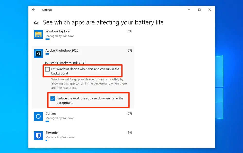 3) Windows будет отображать приложения в порядке использования заряда батареи. Выберите приложение, потребляющее много энергии, и снимите флажок "Разрешить Windows управлять фоновой работой этого приложения", затем установите флажок "Ограничить фоновую работу этого приложения".